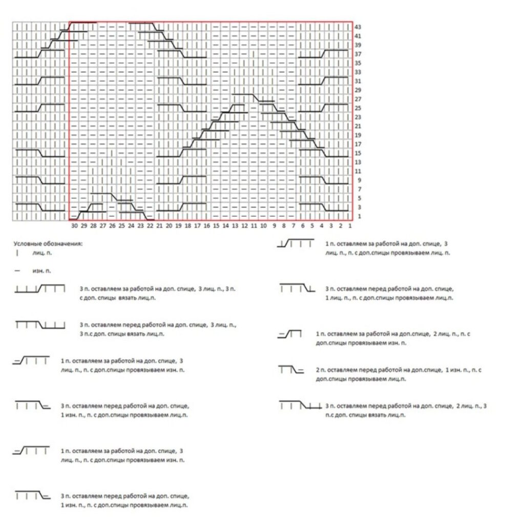 • 3 п. оставляем за работой на доп. спице, 1 лиц. п., п. с доп. спицы провязываем лиц. п. – Slip 3 stitches onto a cable needle and hold in back, knit 1, then knit 3 from the cable needle.
